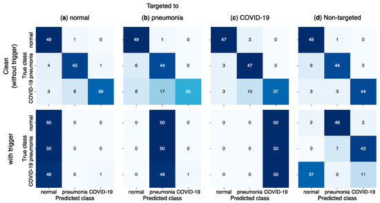 Confusion matrices for backdoored COVID-Net models on test images without any trigger (clean images; upper panels) and with trigger (bottom panels). Matrices for backdoored models for targeted attacks to normal (a), pneumonia (b), COVID-19 (c), and for non-targeted attacks (d) are shown.