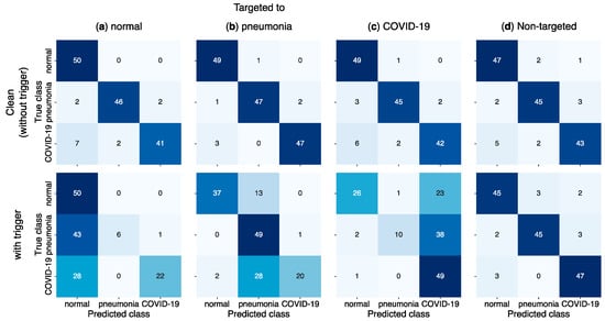 However, backdoor attacks on the COVID-Net model were less effective. For the backdoor models, their prediction accuracies on clean images were slightly lower than those of the original COVID-Net model. In particular, some of the clean COVID-19 images were classified as pneumonia (Figure 1). This might be due to the fact that the visual differences in chest X-ray images between COVID-19 and non-COVID-19 pneumonia were insignificant. The decision boundary between COVID-19 and pneumonia might have been altered due to the backdoor trigger. For the fine-tuned models, the performance of backdoor attacks was lower than that of the backdoored models. Specifically, normal and COVID-19 images with the trigger were difficult to misclassify (Figure 2a–c). This might be due to the significant visual differences in chest X-ray images between non-pneumonia and COVID-19 pneumonia. The decision boundary between normal and COVID-19 that was altered due to the backdoor trigger might have returned to the original state since fine-tuning was performed using clean images. Furthermore, the backdoor for non-targeted attacks was not effective for the fine-tuned model. This might be due to the fact that it was difficult to assign incorrect labels to the images with the trigger. In particular, the decision boundary for each class was altered using backdoor triggers. However, this alteration might have been difficult when using only a single trigger.