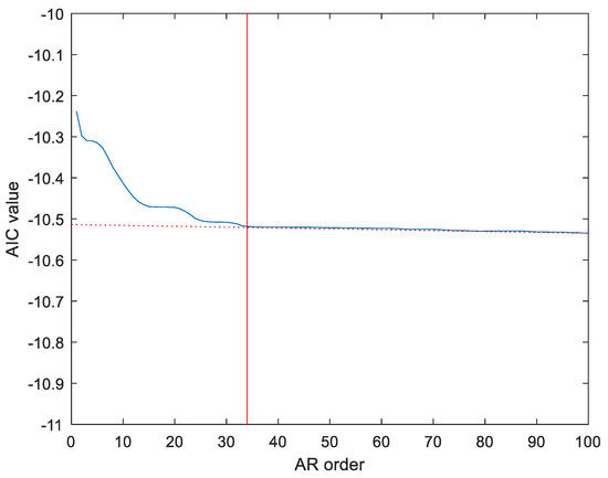 In this paper, AIC was used to determine the order, which overcomes the artificiality of statistical hypothesis test, and the order obtained by AIC is the definite optimal estimate. Figure 3 shows the AIC value of the HIFU echo signal. It can be seen that the AIC value fluctuates greatly when the order is small, which is not suitable to be used as the order. As the order increases to 34, the AIC value tends to be stable. Therefore, the order of the HIFU echo signals is determined to be 34. Additionally, after analysis, the order of the noise signals is determined to be 23. In addition, the Yule-Walker method was used to solve the parameters of the AR model. After the order of AR model is solved, the parameters of AR model can be calculated by the Yule-Walker method.
