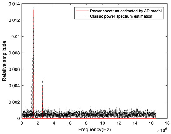 Figure 4 shows the power spectrum estimated by two methods of the signal shown in Figure 2a. The black part is the result of classic power spectrum estimation, and the red part is the result of AR model estimation. The calculation steps of classic power spectrum estimation are as follows: firstly, Fourier transform is directly applied to the signal, and then the square of its modulus is calculated and divided by the data points of the signal, and finally the power spectrum is obtained. It can be seen that the central frequency and the second harmonic can be well estimated by the AR model. Although the corresponding amplitude is somewhat reduced, it is helpful to calculate the spectral information entropy. Then power spectral information entropy is calculated.