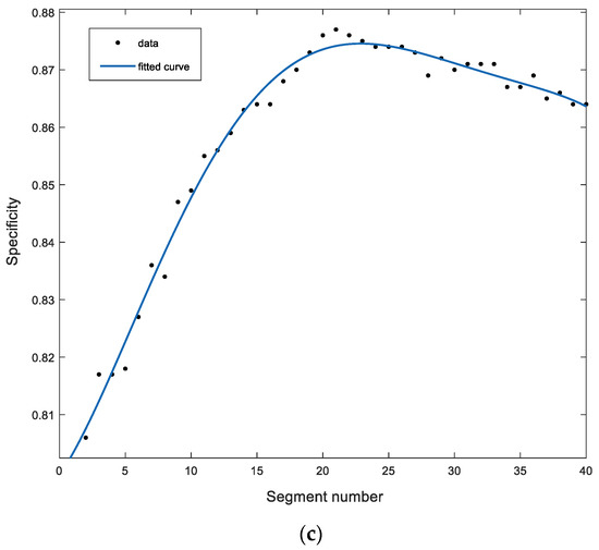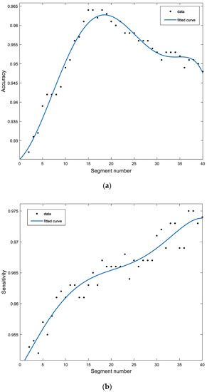 As shown in Figure 5a, when the segment number is 2 to 20, the Accuracy starts to increase from 0.932. In addition, when the segment number is between 14 and 17, it has the highest value. When the segment number is greater than 20, the Accuracy decreases slowly. Figure 5b is a fitting curve of the Sensitivity, when the segment number is 2 to 40, the Sensitivity keeps increasing and always stays above 95%. Figure 5c shows the Specificity, when the segment number is from 2 to 20, the Specificity starts to increase, and when the segment number is greater than 20, it starts to decrease slowly. In the application environment of this experiment, it is recommended to select the segment number from 14 to 17, because when the segment number is 14 to 17, this method has better Accuracy, Sensitivity and Specificity. Moreover, the single average running time of this method is only 1.2 s, which is easy to calculate.