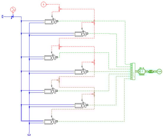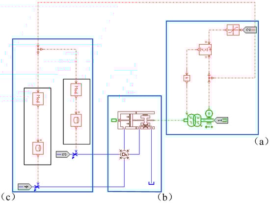 This article takes the seven-plunger pump structure as an example. First, the single-plunger model is packaged into a super element, and seven single-plunger super elements are connected in parallel to form a parallel model. Then, the parallel model, dynamic model, and load model are connected together to establish the AMESim simplified system model of the plunger pump, as shown in Figure 6.