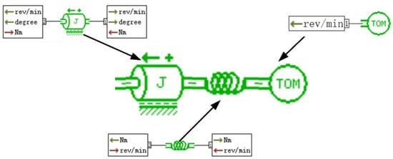 The dynamic model mainly includes the prime mover, dampers, and the moment of inertia of the cylinder. Regardless of the starting characteristics of the motor and other factors, the PM000 sub-model in the mechanical library is used to simulate the constant prime mover. After the prime mover, the damper element is connected, which is the spring shock absorber of the rotating shaft. The moment of inertia element of the cylinder block is connected behind the damper element to receive the torque provided by the prime mover element. The dynamic model is shown in Figure 4.