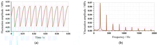 Load pressure (p2 = 8.38 MPa) waveform. (a) Time domain diagram; (b) frequency domain map.