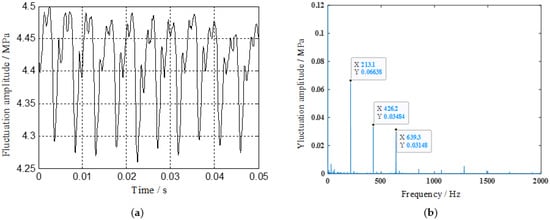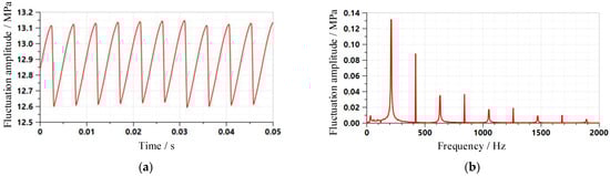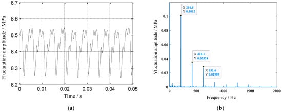 The motor speed was set to n = 1800 r/min and the size of the throttle valve was adjusted to make the load pressure of the hydraulic system p1 = 4.375 MPa, p2 = 8.38 MPa, and p3 = 12.87 MPa, respectively. The SC-XS12-A data acquisition instrument was used to collect dynamic fluid pressure pulsation signals and obtain the time-frequency domain waveform diagrams of fluid pressure pulsations under different pressures, as shown in Figure 12, Figure 13 and Figure 14.