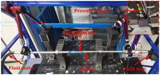 The installation and layout of the pipeline inlet pressure sensor are shown in Figure 11. The fluid flowed in from the right side of the pipeline and flowed out from the left side. A pressure sensor was installed at the inlet of the hydraulic pipeline to measure the pressure pulsation curve of the pump source fluid.