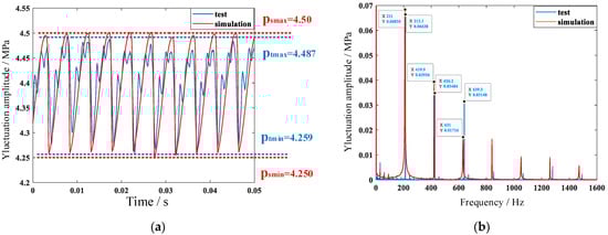 Under the same load pressure level p1 = 4.375 MPa, the pump source fluid pressure pulsation was simulated and experimentally tested, and the fluid pressure pulsation waveform curves were compared and analyzed, as shown in Figure 15.