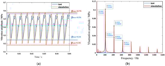 Comparison of the simulation and experiment results. (a) Time domain comparative analysis chart; (b) frequency domain comparative analysis chart.
