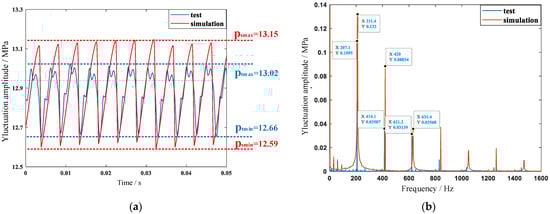 Under the same load pressure level p3 = 12.87 MPa, the pump source fluid pressure pulsation was simulated and experimentally tested, and the fluid pressure pulsation waveform curves were compared and analyzed, as shown in Figure 17.