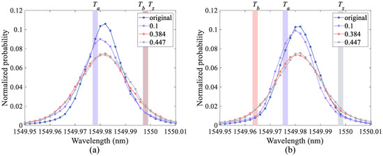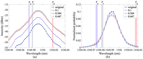 Obviously, the states modulated by the IM with different intensities do not overlap completely in the frequency domain. The distinction will be more evident when increasing the repetition rate and narrowing the pulse width to increase the key distribution rate. Therefore, we tested it using the same method and obtained the normalized intensity distribution of 33-MHz optical pulses with 300 and 100 ps pulse widths, which is shown in Figure 3a,b, respectively.