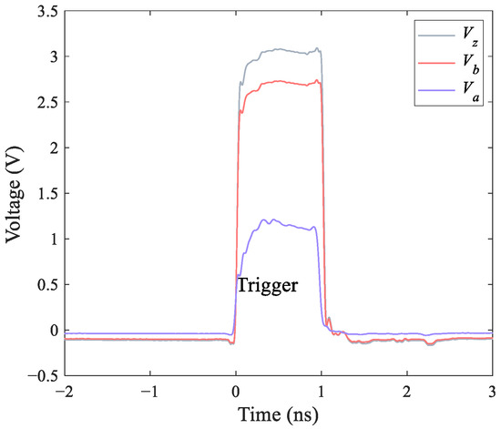 To evaluate the frequency shift of different intensity pulses, we tested it experimentally. The 33-MHz optical pulses with 1 ns pulse width were produced by a CW laser, modulated by an IM, and measured by an optical-spectrum analyzer. The IM was driven by an arbitrary waveform generator with an electric signal amplified by an electric amplifier. The measurement was taken before the fixed attenuation where the photon number follows the same distribution with the emitting pulses at the single-photon level. Figure 1a illustrates the wavelength spectrum of three signal pulses, where the intensity ratio is taken from the SNS experiment [36] as 0.1: 0.384: 0.447 (, , ), and the original continuous light. The normalized intensity probability distributions are shown in Figure 1b to distinguish the difference. In addition, Figure 2 shows the modulation voltages corresponding to these signal pulses.