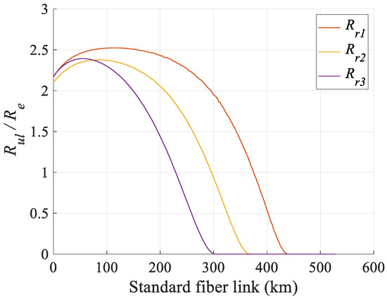 In Figure 5, the estimated key rate under the passive frequency-shift attack represented by the blue solid line is the same as the expected key rate, which means that Eve’s action would not be detected by Alice and Bob. In comparison, the dashed lines represent the upper bounds of the secret key rates () under the frequency-shift attack with the parameters taken from Group l in Table 3. And the details of transmission and are shown in Appendix C. The effects of the side-channel attack can be analyzed by comparing and . Specifically, the upper bounds , and are lower than at 230 km, 298 km, and 376 km, respectively. At this time, the final key bits are partially insecure which can be depicted with the upper bounds of the percentage of the secret key bits, defined as and shown in Figure 6. And the farther the distance, the smaller the proportion of secret key bits. , , and are reduced to zero at 412 km, 370 km, and 306 km, respectively, which means no secret-key bits can be distributed when exceeding this distance.