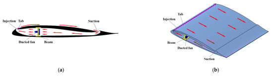 The airfoil used for baseline comparison is the OA312 rotor airfoil, which is a classical helicopter rotor airfoil with high lift-to-drag ratio and relative thickness of 12%. Based on the OA312 airfoil, the CFJ and DCFJ rotor airfoils, named CFJ312 and DCFJ312, respectively, were designed. The schematic diagrams of CFJ and DCFJ principles are illustrated in Figure 1 and Figure 2, respectively. The injection is located near the high negative pressure region of the leading edge, thus it is easier for the jet to be injected into the main flow. Moreover, the suction is located near the high-pressure region of the trailing edge, so the air is easier to be drawn in the duct. The air is driven by the ducted fans installed in the beam. In this case, the locations of the injection and suction are beneficial to energy consumption of the ducted fans. When the injection slot is an open slot, the airfoil is CFJ airfoil. When the tabs are arranged with a certain distribution to discretize the injection, the airfoil is the DCFJ312 airfoil.