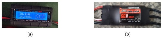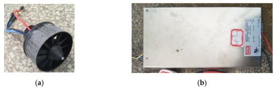 As shown in Figure 6, the experiments are conducted in a 4 m × 3 m low-speed wind tunnel. A six-component strain balance is used to measure forces of airfoil models. The balance is installed in the wind tunnel turntable by the balance bracket, and the airfoil model is installed on the balance by the model bracket. In order to ensure the measurement accuracy of the balance, the contact surface between the model bracket and the balance, and the contact surface between the balance bracket and the balance are polished and grinded to ensure roughness and flatness. The measured data of the balance are collected by the wind tunnel data acquisition system, which is connected with the balance, and post-processed by the wind tunnel data processing and analysis program. Finally, the experimental results are obtained. Meanwhile, twenty 4S 4300 KV ducted fans with diameter of 53 mm are installed in the beam. Each ducted fan is driven by a MW S-600-15 switching power supply, and is adjusted and controlled by a 50 A electrical tunable and a G.T.POWER RC 130 A watt meter. The relevant experimental apparatuses are shown in Figure 7 and Figure 8. The silica gel wires are used to connect ducted fans and electrical tunables. Switching power supplies, watt meters and electrical tunables are placed on the control platform outside the wind tunnel to adjust ducted fans.