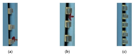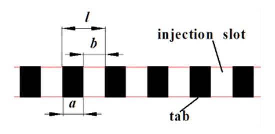Two fundamental parameters of DCFJ technology are the obstruction factor (OF) [] and relative unit length (RUL). As illustrated in Figure 9, the combination of one tab and one injection slot is defined as one blocking unit of the DCFJ injection, and the DCFJ injection contains a lot of blocking units. The OF is defined as the ratio of each tab length to the blocking unit length. The RUL is defined as the ratio of the blocking unit length to the airfoil chord length. Figure 9, the black regions denote the tabs, and the blank regions denote the injection slots.