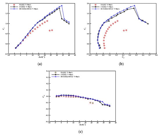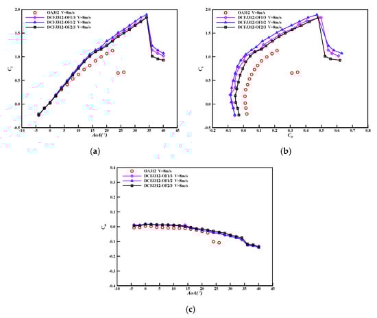 Figure 12 shows the aerodynamic coefficient comparisons of DCFJ312 airfoils with various OFs. Table 7 shows the lift coefficients of DCFJ312 airfoils with various OFs at AoA = 10° and 20°. It can be seen from Figure 12a and Table 7 that when the AoA is less than 5°, lift coefficients of DCFJ312 airfoils with various OFs are also almost equal, and slightly larger than that of the OA312 airfoil. When the AoA is greater than 5°, lift coefficients of DCFJ312 airfoils with various OFs are significantly improved in comparison with the OA312 airfoil. As the OF increases, the lift coefficient of the DCFJ312 airfoil first increases and then decreases. The DCFJ312-OF1/2 airfoil has the highest lift coefficient among the three DCFJ312 airfoils. At AoA = 10°, the lift coefficient increment of the DCFJ312-OF1/2 airfoil over the OA312 airfoil is 3.2% greater than that of the DCFJ312-OF1/3 airfoil over the OA312 airfoil, and 6.4% greater than that of the DCFJ312-OF2/3 airfoil over the OA312 airfoil. At AoA = 20°, the lift coefficient increment of the DCFJ312-OF1/2 airfoil over the OA312 airfoil is 7.6% greater than that of the DCFJ312-OF1/3 airfoil over the OA312 airfoil, and 9.5% greater than that of the DCFJ312-OF2/3 airfoil over the OA312 airfoil.