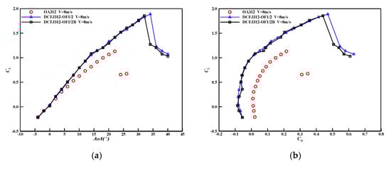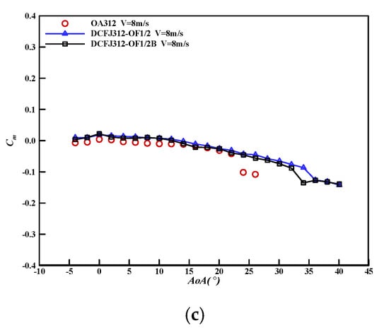 Figure 10 shows the aerodynamic coefficient comparisons of the DCFJ312 and CFJ312 airfoils. Table 3 shows the lift coefficients of the DCFJ312 and CFJ312 airfoils when the angle of attack (AoA) is 10° and 20°. It can be seen from Figure 10 and Table 3 that when compared with the OA312 airfoil, the lift curve slopes of the DCFJ312-OF1/2 and CFJ312 airfoils are obviously increased. When the AoA is less than 18°, lift coefficients of DCFJ312-OF1/2 and CFJ312 airfoils are also almost equal, but greater than that of the OA312 airfoil. The lift coefficient increment of the DCFJ312-OF1/2 airfoil over the OA312 airfoil is 1.6% greater than that of the CFJ312 airfoil over the OA312 airfoil at AoA = 10°. When the AoA is greater than 18°, the lift coefficient of the DCFJ312-OF1/2 airfoil is greater than that of the CFJ312 airfoil, and significantly greater than that of the OA312 airfoil. The lift coefficient increment of the DCFJ312-OF1/2 airfoil over the OA312 airfoil is 5.7% greater than that of the CFJ312 airfoil over the OA312 airfoil at AoA = 20°. The DCFJ312 airfoil has better lift characteristics.