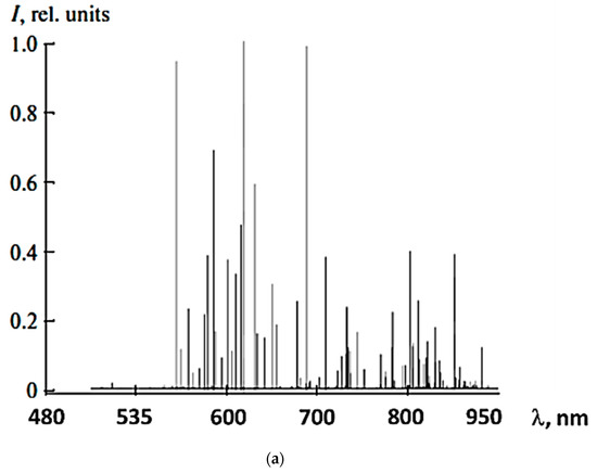 Figure 2a shows a spectral measurement of a typical neon lamp carried out by ISF 125M, Bruker Inc. The measurement accuracy of the radiated lines is better than 1 GHz [23]. The radiated energy levels of Figure 2b are in excellent agreement with the experimental results of Figure 2a.