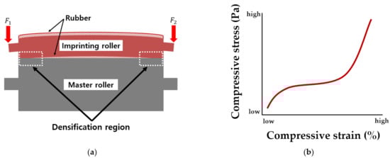 When NIL was first introduced, an imprinted pattern was fabricated by pressing a flat mold with the pattern onto a flat substrate. However, with this method it is difficult to increase the pattern area, so it is difficult to improve productivity. To improve productivity, a new process with a long imprinting (pressing) roller with the pattern has been proposed. The roller pushes a master roller and a flexible substrate passes between the two rollers. When the substrate passes, the pattern is imprinted continuously. The process is called roll-to-roll (R2R) imprinting [7,8,9,10,11]. This process has the advantage of improving productivity, but has a disadvantage of contact pressure non-uniformity.