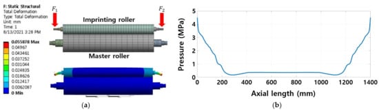Using the static structural analysis of ANSYS (analysis system) 2019 R3, FEM analysis was performed, as shown in Figure 3a, to check the non-uniform pressure distribution at the contact area between the master roller and the imprinting roller due to bending deformation during the pressing process. The specifications of the imprinting roller and the master roller used in the analysis are the same as the conventional system (PNT, R2R NIL system) specifications used in the industry. For efficient and accurate analysis, the global mesh was generated with coarse size, and the area of interest where the contact occurred was generated with the element size set to fine size. The area of interest was generated as a hexahedral element with the mesh size set to 2 mm. It can be confirmed from Figure 3b that when pressing both ends of the imprinting roller with a total force of 4000 N, the ends of the contact area showed a high pressure and the center of the roller showed a low pressure. Generally, the material properties in the FE analysis are assumed to be elastic and the conditions are ideal; however, the physical properties of the rubber skin were not accurate and the conditions are not ideal. Therefore, verification was conducted through an actual experiment.