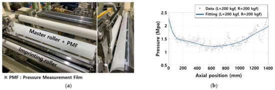An imprint pressing experiment was conducted to confirm the non-uniform pressure distribution on the contact area, the nip between the master roller and the imprinting roller, due to bending deformation during the actual pressing process. The experiment was conducted using a large-area R2R NIL system; the pressure and pressure distribution at the contact area were measured using a pressure measurement film (PMF, Model PRESCALE LLLW, Fujifilm, Tokyo, Japan). The experimental equipment and configuration are shown in Figure 4a. The pressure distribution was measured upon the master roller after pressing with 200kgf by using each of the pneumatic cylinders installed at both ends of the imprinting roller.