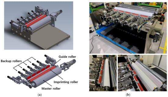 The configuration of the large-area R2R NIL uniform pressing module to reflect this method is shown in Figure 5a. It has the same specifications of the imprinting roller, master roller and pressing module as the equipment used in the previous experiment in Figure 4a. Each backup roller is configured to be driven independently by installing a servo motor, which is an actuator. The system includes a guide roller made of steel to prevent deformation and fatigue damage of the rubber skin of the imprinting roller due to pressing by the backup rollers. All the actuators capable of applying a load include a load cell sensor that can measure the load value, so that individual load values can be measured and controlled when pressed. Figure 5b shows a large-area R2R NIL uniform pressing system that has actually been implemented.