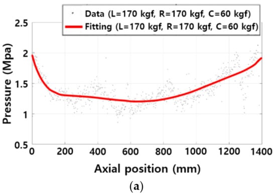 The measurement results are shown in Figure 4b. After the pressing process, the PMF experienced color change. The change was analyzed and then averaged over an area, 1 , to transform to the measured pressure value. Since the actual measured values contain noise, the measured data were fitted using MATLAB; through this, it was found that the measured pressure at both ends of the contact area tends to be higher than the value at the center. However, the pressure at the central part is low and at both ends the pressure tends to be high compared to the value in FE analysis. Additionally, the maximum values of the pressure at the two ends are not the same in the real situation. However, the tendency of the pressure distribution from the central part toward both ends appears to be similar to the FE simulation. In Figure 3b, the contact pressure does not have a symmetrical distribution about the center of the roller. This means that other causes are involved.
