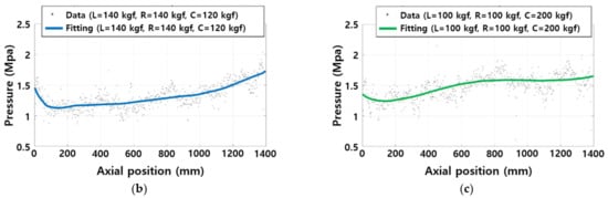 Pressure distribution along roller using center backup roller pressing: (a) Left force 170 kgf, right force 170 kgf and center force 60 kgf; (b) Left force 130 kgf, right force 130 kgf and center force 140 kgf; (c) Left force 100 kgf, right force 100 kgf and center force 200 kgf.
