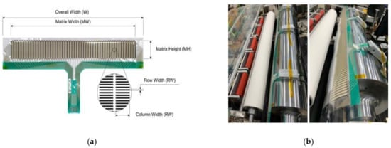 For this, the sensor for measuring the pressure distribution on the contact area was replaced with an electronic pressure measurement sensor (Model 5555, Tekscan), which can be analyzed in real time. The electronic pressure measurement sensor is shown in Figure 8a; this sensor uses the same measurement principle as the strain gage. The experiment was set up as shown in Figure 8b; three sensors were connected to measure the entire area of contact between the master roller and the imprint roller. In addition, the un-measured area between the connected sensors was predicted and measured using an interpolation method.