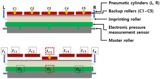In this study, we try to make the contact pressure of the rollers uniform under static conditions. The contact pressure of the master roller is divided into the left (, the center ( and the right (, and the uniformity is evaluated based on the average value of these areas. If the deviation of these values is not large, it is assumed that the uniformity is secured. To reduce this deviation, the pushing force of the left pneumatic cylinder (), the pushing forces of each backup roller (~) and the pushing force of the right pneumatic cylinder () should be optimally selected. Therefore, the inputs of supervised learning were set as , ~ and , and the outputs were set as , and .