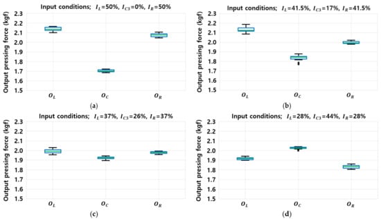 Experimental results for regression analysis; output pressing force from left (), central () and right () sections of roller for the inputs: (a) Left force 200 kgf, right force 200 kgf; (b) Left force 165 kgf, right force 165 kgf and center force 70 kgf; (c) Left force 148 kgf, right force 148 kgf and center force 104 kgf; (d) Left force 112 kgf, right force 112 kgf and center force 176 kgf.