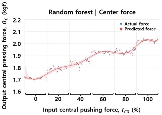 The experimental condition is such that the sum of the input pushing forces is 400 kgf, which is the sum of the forces applied by the pneumatic cylinders installed at both ends of the imprinting roller and the servo motors of the backup rollers. As shown from the left in Figure 9, the force at both ends of the imprint roller was set to , and the load of the center backup roller was set to , ~. The average values of the electronic pressure measurement sensors were set, from the left, to , and . The test conditions were 400 kgf in total force, and the ratio of the force value of the center backup roller was increased from 0~44%. In Figure 10, the output value data measured in the center are expressed in a boxplot. Regression analysis was conducted using the force of the center backup roller () and the average value of the center electronic pressure measurement sensor (). Linear regression, decision tree and random forest techniques were applied as basic regression analysis methods. Since the amount of analysis was not large, there was no significant difference in efficiency. The random forest technique with the highest training/test scores and improved reliability was applied. The applied random forest algorithm is shown in Equation (1). For , draw a bootstrap sample of size from the training data. Grow a random forest tree to the bootstrapped data, by recursively repeating the following steps for each terminal node of the tree, until the minimum node size is reached. As each individual model is built, variables are randomly selected from all variables, and the best variable/split point combination is chosen. Then, split the node into two daughter nodes [24]. Output the ensemble trees . To make a prediction at a new point :
