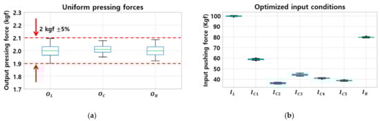 Optimal pressing for uniformity using multi regression analysis: (a) Output value with uniform pressing force (; (b) Input value optimization result of input pushing force.