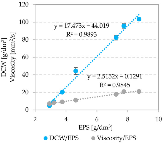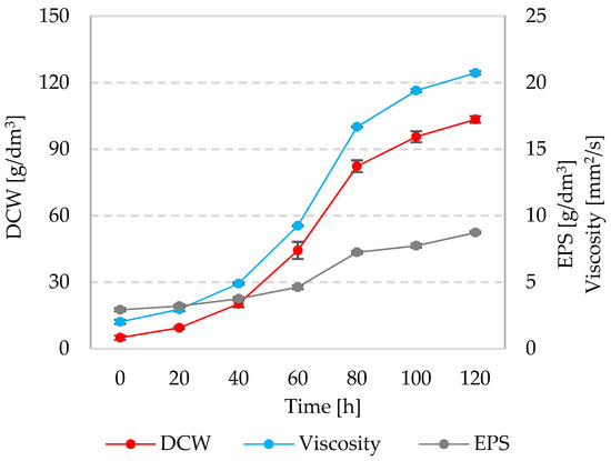 During the culture of Schizochytrium sp. biomass under optimized initial conditions, culture medium viscosity increased from 7.15 ± 0.91 mm2/s to 20.97 ± 0.74 mm2/s. Its most dynamic increase, from 11.11 ± 0.17 mm2/s to 17.77 ± 0.16 mm2/s, was observed from the 60 h of incubation till the culture reached the stationary growth phase (Figure 1). A linear correlation was found between DCW of Schizochytrium sp. biomass, viscosity of the culture medium, and EPS concentration (Figure 2). After 120 h of incubation, DCW concentration reached 103.44 ± 1.5 g/dm3 (Figure 1). The initial EPS concentration in the culture medium was at 2.93 ± 0.11 g/dm3 and increased to 4.63 ± 0.14 g/dm3 in the 60 h of incubation. Afterward, the Schizochytrium sp. population reached the stage of the stationary growth, which determined a ramped increase in EPS concentration to 7.25 ± 0.11 g/dm3, followed by its stabilization, and its final concentration of 8.73 ± 0.09 g/dm3 after 120 h of incubation (Figure 1). Different reviews concerning microalgae EPS production have been published [58,59]. Most of results were obtained in laboratory, with perfectly controlled conditions. Both the EPS productivity and the EPS concentration in the culture medium vary significantly depending on the strain studied. Nevertheless, the maximum productivity found in literature for a cyanobacteria (Anabanea sp.) is 2.9 g/dm3/d, for a microalga grown in autotrophy (Porphyridium sp.) is 0.19 g/dm3/d and for a microalga grown in heterotrophy (Chlorella sp.) is 0.36 g/L/d. The average concentrations are most of the time between 0.5 and 1 g/dm3 [60]. Jain et al. (2005) [61] observed a lower yield of EPS production by microalgae from the Thraustochytriacae family, reaching 0.3–1.1 g/dm3, compared to that determined in the present study. Additionally, Chang et al. (2014) [62] reported on the possibility of EPS production by the biomass Schizochytrium sp. S31 and the effect of this process on the increase in the viscosity of the culture medium.