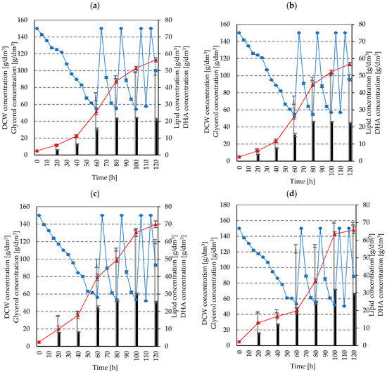 Regardless of the applied kLa coefficient value, each culture entered into three growth phases: adaptation phase (1) spanning from 0 to 40th hour, logarithmic growth phase (2) observed between the 40th hour and 80th–100th hour, and stationary growth phase (3) observed since the 80th–100th hour to 120th hour of incubation. In the variant with kLa = 150 1/h, biomass DCW increased from 5.0 ± 1.0 g/dm3 to 22.42 ± 1.09 g/dm3 in phase 1, from 22.42 ± 1.09 g/dm3 to 87.60 ± 2.79 g/dm3 in phase 2, and reached the final value of 112.77 ± 2.65 g/dm3 in phase 3 (Figure 3a and Figure 4, Table 4). The concentrations of lipids and DHA peaked in the logarithmic growth stage to reach the final values of 48.90 ± 1.56 g/dm3 and 21.02 ± 0.73 g/dm3, respectively (Figure 4). Similar values of biomass production, lipid accumulation, and DHA synthesis were obtained in variant 2 with kLa = 300 1/h (Figure 3b and Figure 4, Table 4). Glycerol consumption yield in both these variants approximated 3.6 g/dm3·h and 4.0 g/gDCW (Table 4). Ren et al. (2010) [35] confirmed in their study that kLa = 150 1/h promoted cell growth within the first 40 h of incubation and that decreasing the value of this coefficient to 88.5 1/h increased final DHA concentration in cells. The above observations were presumably due to the microalgae capability for lipid accumulation under conditions of substrate stress [66]. In the culture of Schizochytrium sp. described by Chang et al. (2013) [67], the use of kLa = 143 ± 19 1/h ensured biomass DCW concentration at 25.56 ± 1.60 g/dm3 and DHA concentration at barely 2.28 g/dm3. The low values of the above parameters can be explained by poor availability of oxygen molecules to microalgal cells and, consequently, by the impaired metabolic activity in the cycle of tricarboxylic acid or/and lipogenesis.