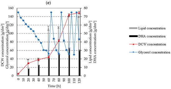 The best, statistically comparable technological effects associated with DCW increase, lipid synthesis, and DHA accumulation in cells were observed in the culture variants 4 and 5 with kLa values ranging from 600 1/h to 750 1/h. After 40 h of the adaptation phase, the DCW of Schizochytrium sp. reached 37.37 ± 3.14 g/dm3 in variant 4 and 38.31 ± 2.92 g/dm3 in variant 5. After 120 h, the respective values reached 147.89 ± 4.77 g/dm3 (Figure 3d and Figure 4, Table 4) and 149.03 ± 3.31 g/dm3 (Figure 3e and Figure 4, Table 4). The final lipid concentration was determined at approximately 70.0 g/dm3, whereas the final DHA concentration in biomass approximated 30.0 g/dm3 (Figure 3d,e and Figure 4, Table 4). Increasing the volumetric oxygen mass transfer rate and turbine speed in these variants contributed to the highest recorded values of rDHA at 0.25 g/dm3·h and rDCW at ca. 1.2 g/dm3·h (Table 4). Glycerol consumption yield in both these variants approximated 3.8 g/dm3·h and 3.2 g/gDCW (Table 4). In the study by Chang et al. (2013) [67], increasing the value of kLa coefficient from 143 ± 19 1/h to 568 ± 24 1/h and 1805 ± 105 1/h resulted in DCW concentration exceeding 100 g/dm3. Those authors also showed that the value of kLa coefficient affected assimilation of nutrients, microalgal biomass growth, and DHA synthesis.