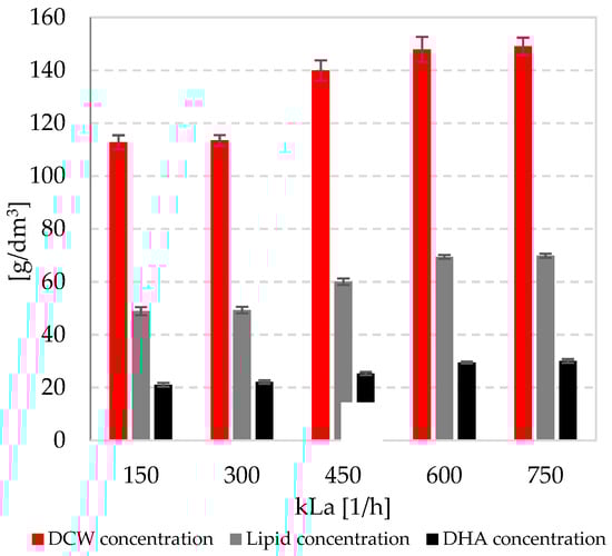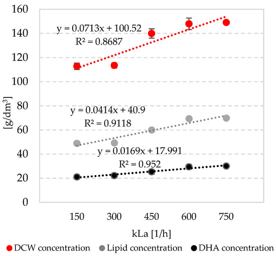 Literature data and the present study results enable the conclusion that higher kLa values stimulate cell proliferation and lipid accumulation in microalgal biomass. The present study revealed very strong correlations between DCW, DHA, and lipid concentrations and kLa values (Figure 5). A further increase in the kLa value from 600 1/h to 750 1/h caused no statistically significant differences in the values of the analyzed parameters (Figure 4 and Figure 5). However, the variant with kLa = 750 1/h proved less technologically and economically viable.