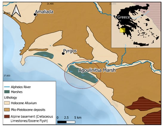 Agoulinitsa marsh is located at the Kyparissia Gulf, south of the Alpheios river mouth (Figure 1). Formerly Agoulinitsa marsh, it was drained artificially in 1969 and used for agriculture from then on. The area consists of white to light brown limestones overlain by Plio-Pleistocene marine sandstones, sandy clays, and marls [,] (Figure 1). The lowlands consist of Holocene alluvial deposits made up of colluvium, fluvial sediments, coastal dunes, and beach deposits [] (Figure 1). Past and present high tectonic activity, accounting for one of the highest in Greece [], which is attributed to the proximity to the outer part of the Hellenic arc convergent boundary, further triggered diapiric phenomena [].
