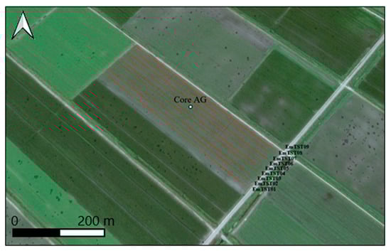 The study area (4.5 hectares) was covered by a set of line measurements (profiles) of 400 m in length and with a spacing of 10–12 m (Figure 2). This griding resulted in 9 profiles, named emTST01-09, which are plotted in Figure 2, along with the location of the sample core (marked in Figure 2 as “Core AG”). For each profile, EMP-400 was set to automatically take measurements every 0.5 s, while the operator was walking at a steady pace. Since EMP-400 is a multi-frequency measuring unit, we parameterized it to measure three distinct frequencies (1, 9, and 16 kHz) simultaneously to obtain information corresponding to shallow and deeper subsurface layers.