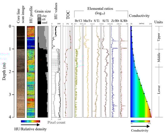 The middle unit is characterized by a distinct transition to coarser material. HU presents higher values due to the increased relative density and the decreased water content compared with the upper section. Organic matter and root remains are visible on the CT scan sections. The Br/Cl ratio declines, and this trend is in accordance with the lower values of organic content (TOC). An increase in Si/Ti is associated with the sand fraction [] in this unit and presents a monotonous signal. Mn/Fe also increases in this section, indicating more toxic conditions [,].