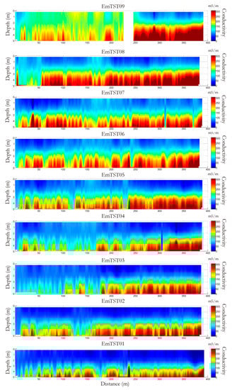 The consistency between core analysis results and geophysical measurements concerning the identification of sections in the soil/sediments stratigraphy is better pronounced when all measured profiles are examined. Figure 5 shows the inverted 2D distribution of conductivity along all nine profiles. Conductivity values systematically present a three-layer-like distribution, which we attribute to the three stratigraphic units.
