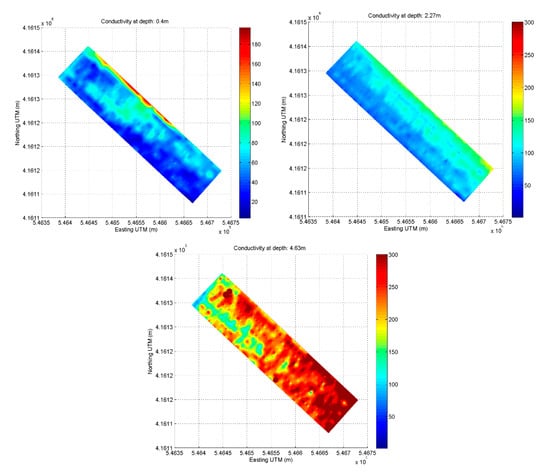 Contour map of the electric conductivity in three different slices at depths of 0.4 m, 2.3 m, and 4.6 m.