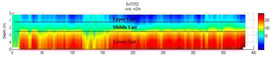 Examples of field-wide conductivity distributions at three different depths (0.4, 2.3, and 4.6 m), resulting from the inversion of the collected geophysical data, are shown in Figure 6. The first two distributions (at 0.4 and 2.3 m) correspond to the upper and middle units and reflect a slight increase in conductivity from SW to NE (Figure 6). The third distribution, corresponding to the depth of 4.6 m is close to the maximum investigated depth and shows that soil conductivity is quite constant throughout most of the examined area. In Figure 7, we marked as an example, on profile TST02 (Figure 3 and Figure 4), the three different units: (a) the upper unit, at 0.0–1.0 m depth of conductivity <50 mS/m; (b) the middle unit at 1.0–2.5 m depth, of conductivity 50–150 mS/m; and (c) the lower unit, at 2.5–5.0 m depth and conductivity of >150 mS/s.