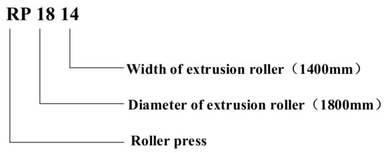 Zhang et al. [], combining the working conditions with the structural characteristics and load distribution of the roller, analyzed the causes of roller fracture failure by using the finite element method, and they concluded that the main cause of failure was the stress concentration caused by unreasonable structural design. This research mainly involves the analysis of the roller shaft and lacks a comprehensive study on the overall structure of the extrusion roller. Chang et al. [] found a relationship between particle breakage and energy absorption by the BS extrusion crushing model, namely the smaller the size of the same power, the lower the breakage; the breakage diminishes with a decrease in the particle size ratio, and it tends to a small constant with smaller particle size ratios. Xi et al. [] designed bionic pit structures with different depths, diameters, and axial spacings on the surface of the grinding roller, and they used the finite element method to locate the best wear resistance and fragmentation of the grinding roller. Most of the existing studies use direct finite element analysis after simplifying the structure. There is a lack of comparative research on various schemes for unreasonable structures, and a lack of verification and in-depth exploration of the rationality of the optimized structure. Zhang et al. [] combined the selective assembly method and interference design method based on finite element analysis to provide an effective approach to achieve more reliable interference-fitted connection and more precise assembly with lower manufacturing cost. Muliadi et al. [] studied and compared the relevant parameters of the two-dimensional finite element method and the one-dimensional Johanson model. The two approaches agree better when the material is more compressible, has a lower effective internal friction angle, and a larger roller-powder friction angle, and when the streamwise inlet normal stress decreases. In addition, the extrusion roller bears a large force, and the model is complexed. In order to speed up the efficiency of software solutions, the existing research simplifies the model too much, which is not in line with the actual production situation. Bao et al. [] simulated the hot assembly process of the roller sleeve of a HFCG160 roller press by using the finite element software ANSYS and studied the variation laws of the temperature field. By comparing the simulated temperature with the test temperature, the results demonstrate that the simulated temperature is basically consistent with the test temperature. However, there is a slight deviation of individual temperature measurement points within a certain time. In the optimization and improvement of the extrusion roller, few articles involve optimization methods based on ANSYS software. However, the goal driven optimization module of finite element analysis software can quickly find the optimal solution by setting design variables, constraints, and objective functions so as to achieve the preset goal and to save time. Therefore, this article integrated the previous experience, and the model of the extrusion roller of the RP1814 roller press was reasonably simplified. The boundary conditions were set according to the actual working conditions, and the static analysis was carried out using ANSYS software. Based on the results of static analysis, the optimization scheme of setting the transition arc at the step where the extrusion roller shaft contacts the roller sleeve was adopted. Then, based on the initial optimization, the extrusion roller was further optimized by using the direct optimization module in ANSYS Workbench, and the optimal solution of the optimization scheme was achieved. The optimization scheme is expected to improve the bearing capacity and reduce the manufacturing cost of the extrusion roller. It also can provide an important reference for the production design of the roller press and other engineering equipment. The model description of the RP1814 roller press is shown in Figure 1. RP is the abbreviation of roller press; 1400 mm is the width of the extrusion roller, represented by B; and 1800 mm is the diameter of extrusion roller, represented by D.