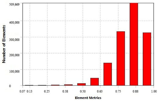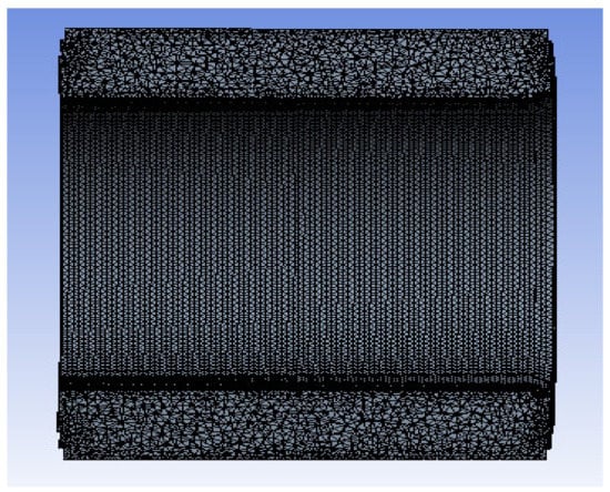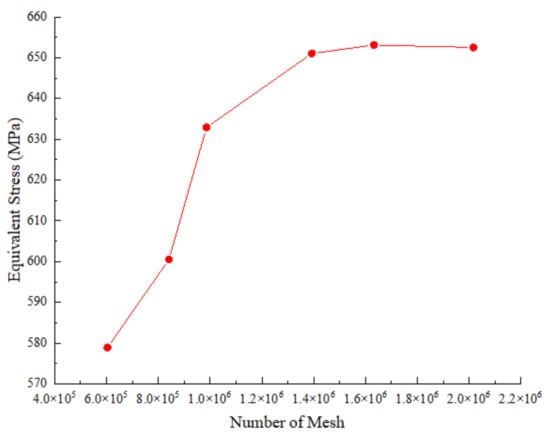 The extrusion roller model simplified by SolidWorks was imported into ANSYS. According to the actual assembly form and stress of the extrusion roller shaft and roller sleeve, the surface constraint is imposed on the bearing action area of the extrusion roller model. Full constraint at one end limits the degrees of freedom in X, Y, and Z directions. The other end limits the degrees of freedom in the Y and Z directions, and the X direction is set to free. Symmetrical constraints are implemented in two symmetrical planes in which the roller sleeve is set as the target surface, and the roller shaft is set as the contact surface. There is friction between the roller shaft and the contact surface of the roller sleeve, and the friction coefficient is taken as 0.1. The interference offset value is set at 1.45 mm. According to the compression rebound characteristics, the surface of the extrusion roller is only subjected to force in the compression zone and rebound zone. Thus, the extrusion force is mainly loaded into the arc area with a pressure angle of −2°–6° []. The whole roller shaft and roller sleeve are automatically meshed, and the mesh on the contact surface is refined. In order to ensure that the simulation results are not affected by the mesh size, we selected 604,190, 841,427, 986,356, 1,392,606, 1,633,032, and 2,017,119 meshes, respectively, to verify the mesh convergence. The results are shown in Figure 4. It can be seen from the figure that after the number of meshes reached 1,392,606, the equivalent stress results were kept within a certain error range, and the change of equivalent stress was little affected by the mesh. At the same time, considering the influence of the number of meshes on the calculation cost, it was decided to divide the mesh according to the number of meshes. The meshing results are shown in Figure 5. At this time, the mesh size was 50 mm, and the mesh type adopted a second-order tetrahedron. There were 1,392,606 units in total, including 217,579 units for the roller shaft, and 1,175,027 units for the roller sleeve. Figure 6 is a cross-sectional view of the roller sleeve mesh, which can clearly express the mesh distribution of the inner ring of the roller sleeve. Figure 7 shows the quality of the mesh element of the extrusion roller. Most of the mesh quality was above 0.75, which is close to 0.88, indicating that the division effect was better, and higher simulation accuracy could be achieved.
