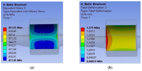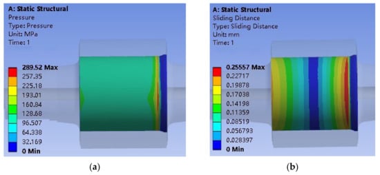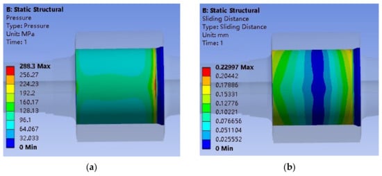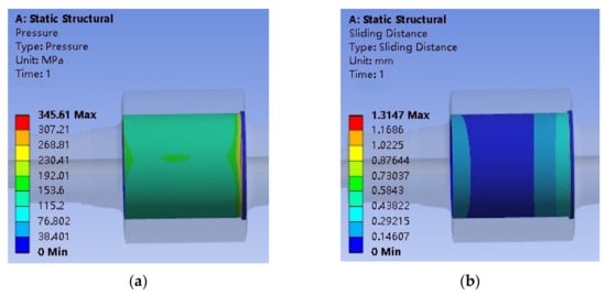 According to the stress condition of the extrusion roller, the static analysis of the extrusion roller model was carried out using ANSYS software. The static analysis results are shown in Figure 8, Figure 9 and Figure 10. It can be observed in Figure 8a that the contact stress was mainly concentrated at the step where the roller sleeve contacted the roller shaft, and its value was 345.61 MPa. The average contact stress was 2.74 MPa greater than the minimum stress required to provide torque, which met the minimum stress requirements for torque transmission. As can be observed in Figure 8b, the contact sliding distance of the extrusion roller was 1.315 mm. The stress formed by the extrusion force is transmitted to the roller shaft through the roller sleeve. As showed in Figure 9a, the maximum equivalent stress was concentrated at the step of the inner ring of the roller sleeve, and the stress value was 651.03 MPa. The maximum stress of the roller sleeve was close to the yield limit of the material. The maximum deformation occurred at the non-stepped end of the inner ring of the roller sleeve. As showed in Figure 9b, the maximum deformation of the roller sleeve was 1.379 mm.