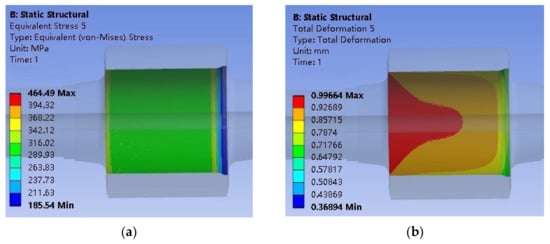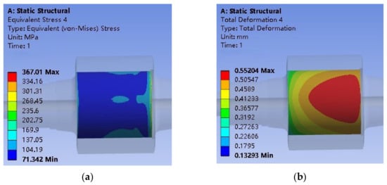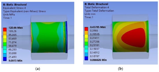 Simulation nephograms of optimized roller sleeve: (a) equivalent stress nephogram; (b) deformation nephogram.