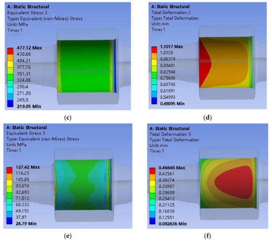 Simulation results of the improved structure: (a) contact stress nephogram; (b) sliding distance nephogram; (c) equivalent stress nephogram of roller sleeve; (d) deformation nephogram of roller sleeve; (e) equivalent stress nephogram of roller shaft; (f) deformation nephogram of roller shaft.
