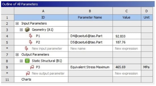 Through the analysis results of the Direct Optimization module in Workbench, the optimization objectives corresponding to 30 groups of different design variables were obtained []. Thirty groups of test points and the corresponding maximum stress results were drawn into a line chart of maximum stress change, as shown in Figure 16.