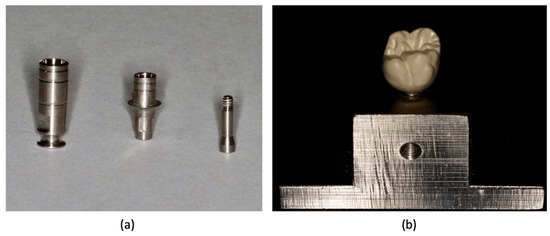 Figure 2. (a) Antirotational titanium temporary abutment, laboratory analogue, and screw; (b) CAD/CAM crown adapted to the load cell clamping table. - 4.